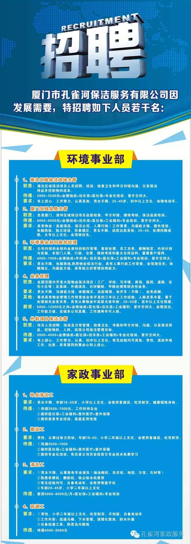 因公司規(guī)模不斷的擴(kuò)大,業(yè)務(wù)不斷的增多,現(xiàn)廈門(mén)孔雀河保潔服務(wù)有限公司向社會(huì)有志之士招收一批人才。廈門(mén)孔雀和重金招聘